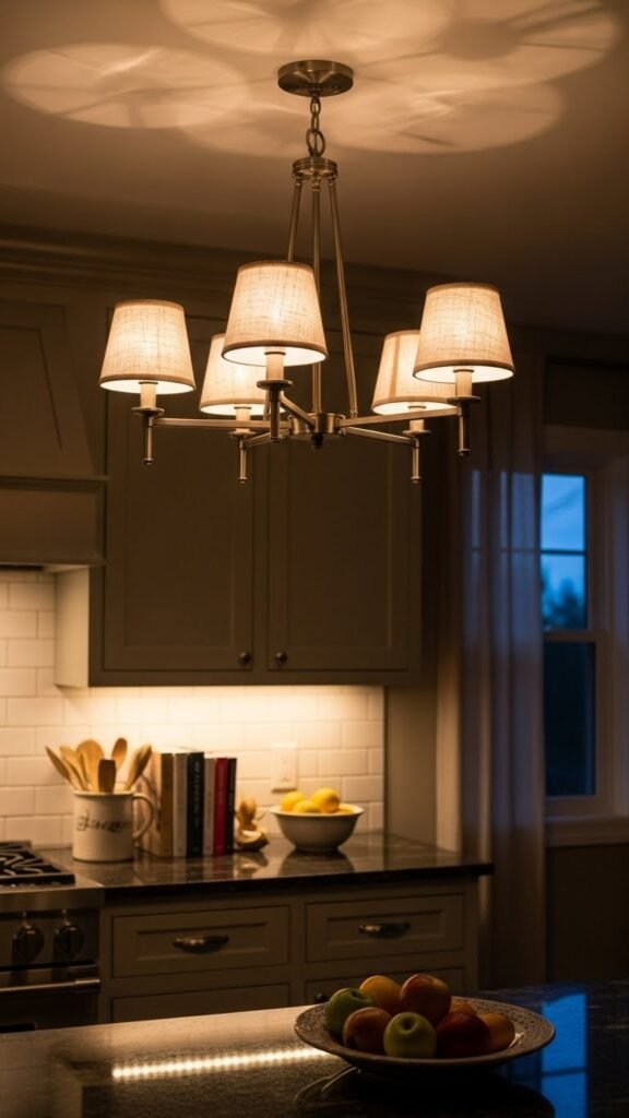 After the soft under-cabinet glow sets a calming base, switch your attention upward to a dimmable chandelier with opaque shades to shape the room’s overall mood.
