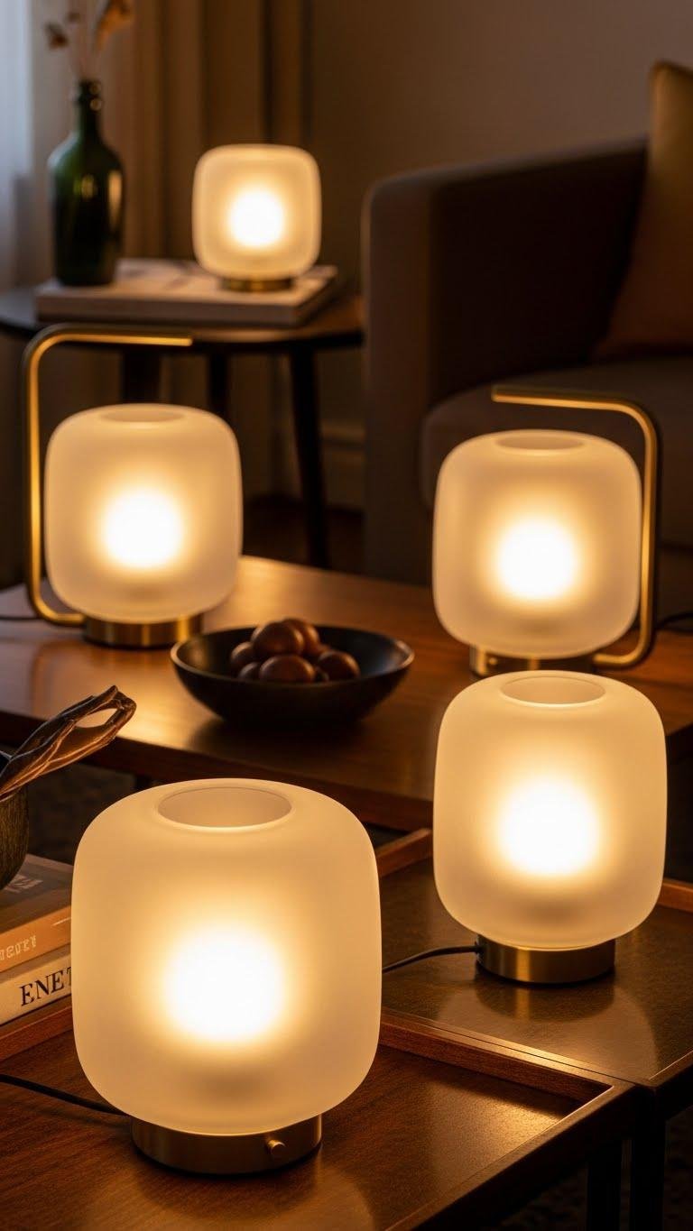 Soft, diffused light from frosted glass table lamps with warm bulbs wraps a room in gentle luminosity, cutting glare while keeping colors true.