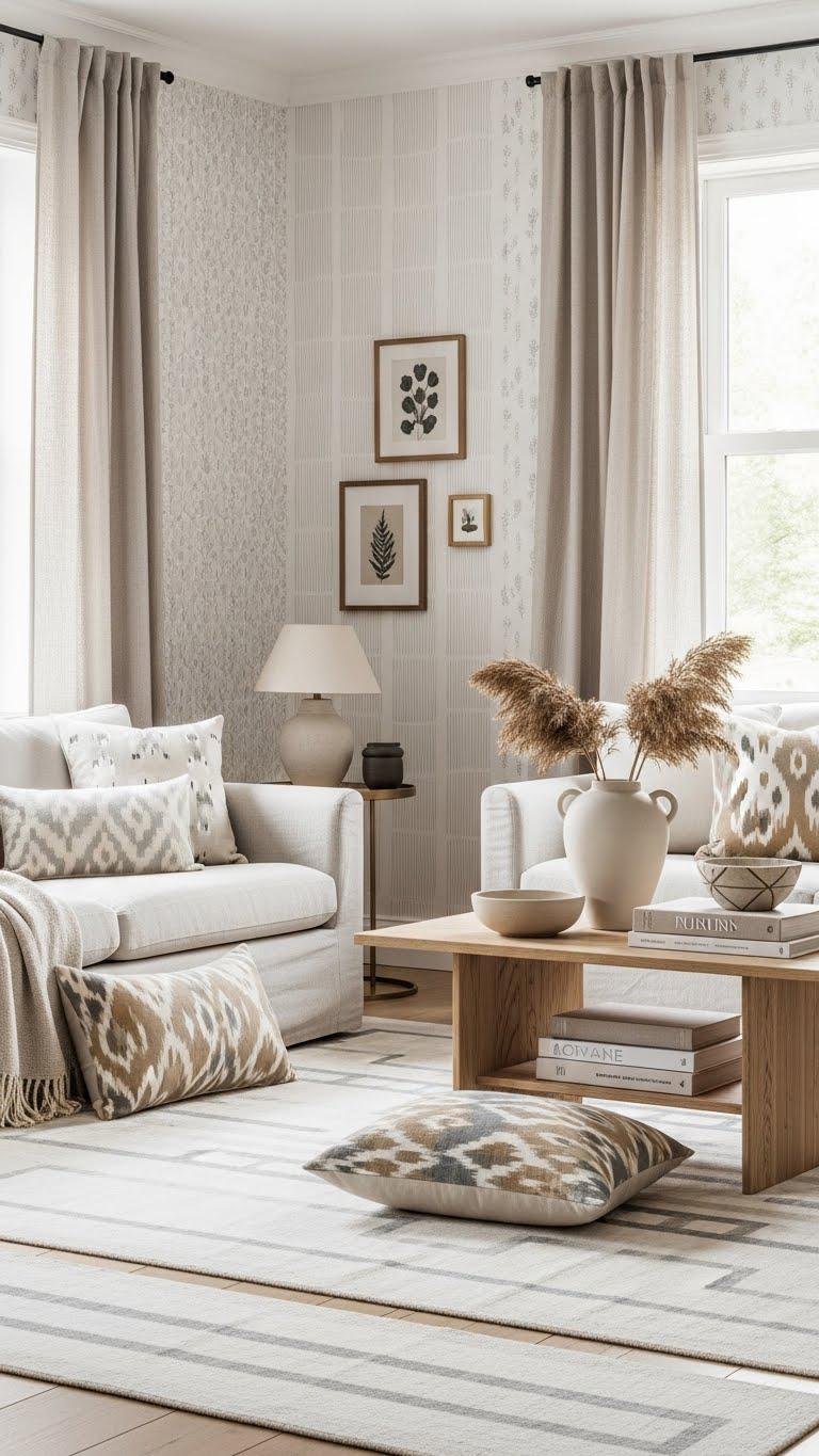 Because neutrals don’t have to be flat, introduce subtle patterning to build depth without stealing the calm—think tone-on-tone geometrics, hairline stripes, and small-scale botanicals that read as texture from a distance.