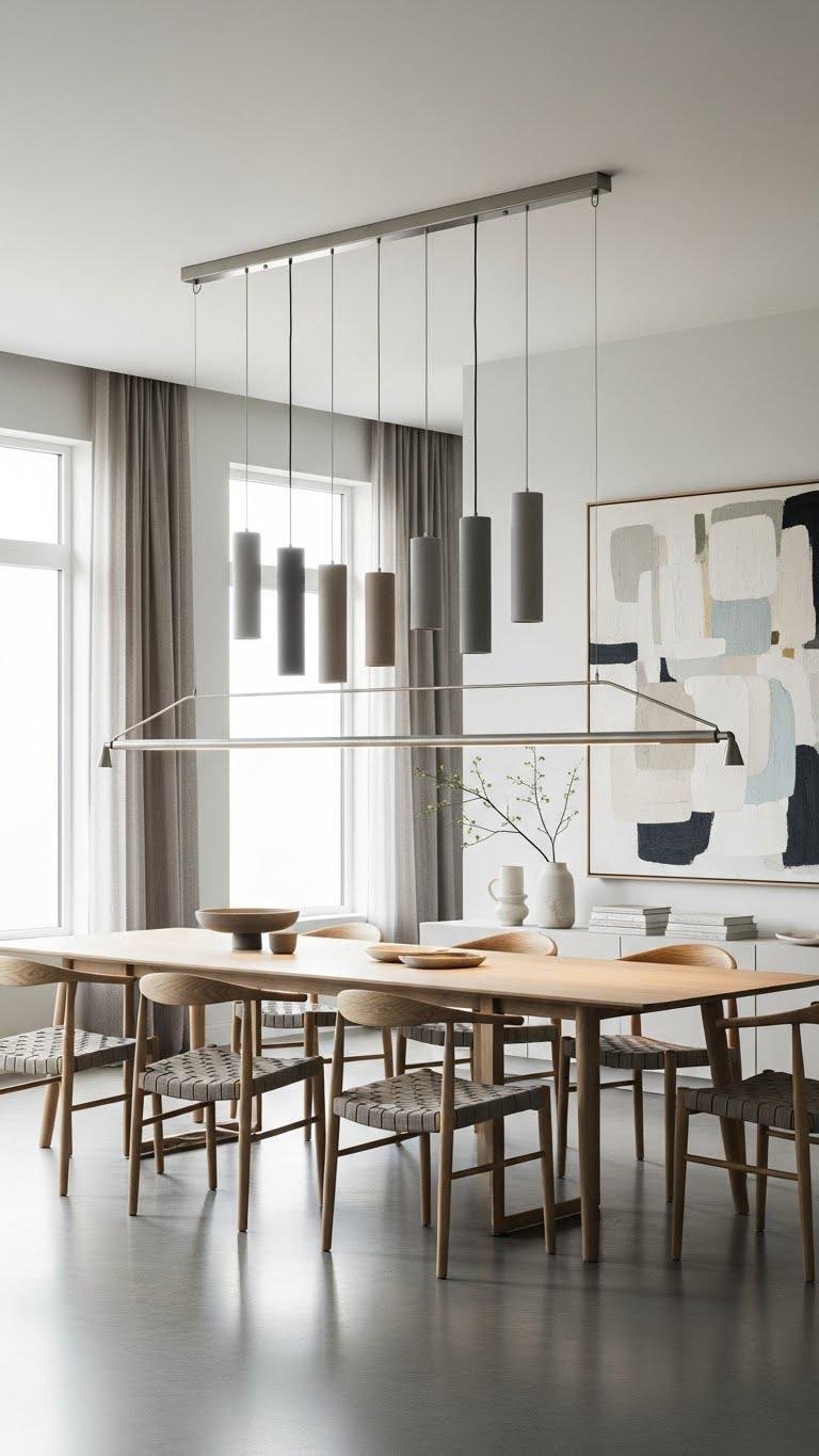 Install a long suspended light to define horizontal sightlines and reinforce the room’s calm, neutral geometry. You’ll choose low-profile fixtures with adjustable suspension to align with furniture and sightlines, keeping proportions airy.