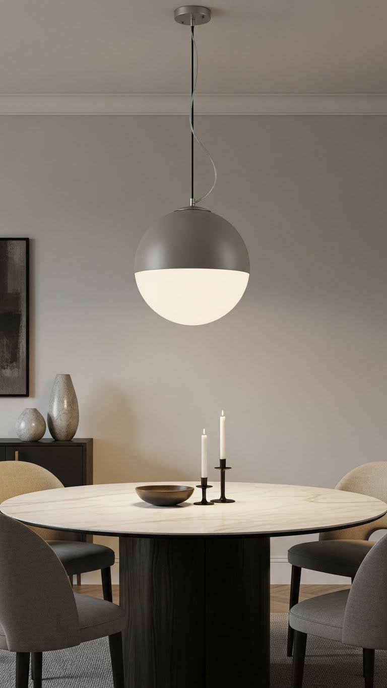 For a dining area that feels both grounded and effortlessly modern, float a large globe pendant above the table to create a clear focal point and balanced illumination.