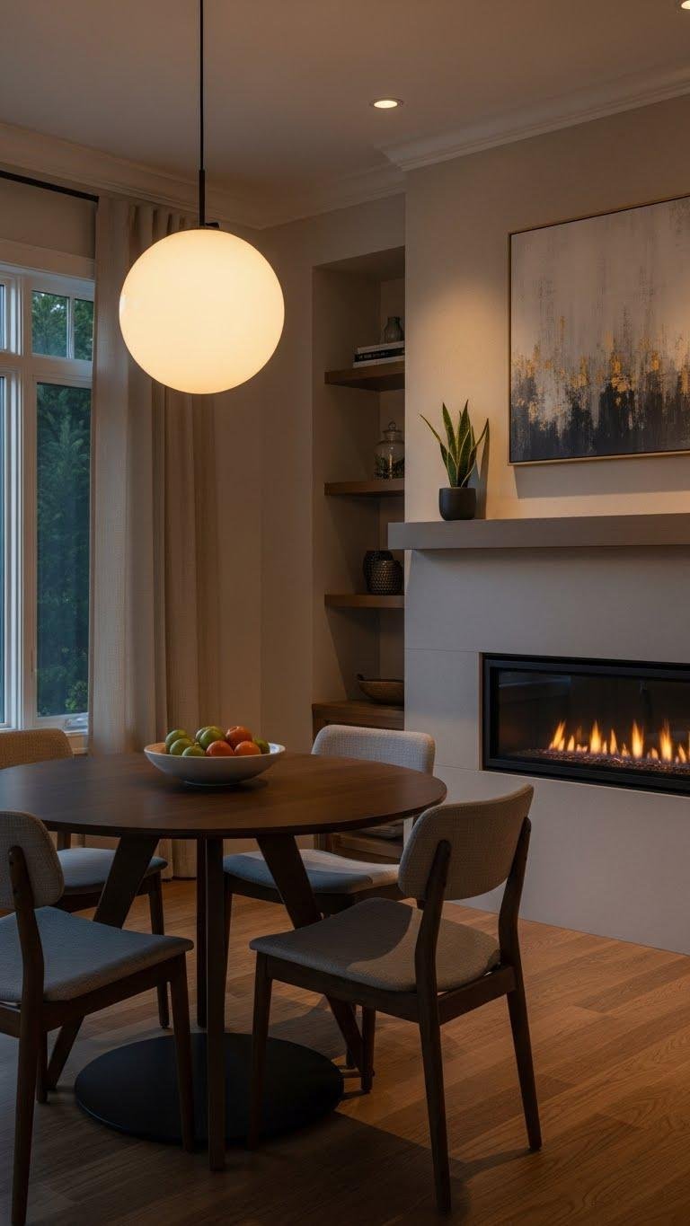 After the soft, communal glow from a globe pendant sets the mood in your dining area, anchor the living space with a stone or linear fireplace to add warmth and visual weight without overpowering the room.