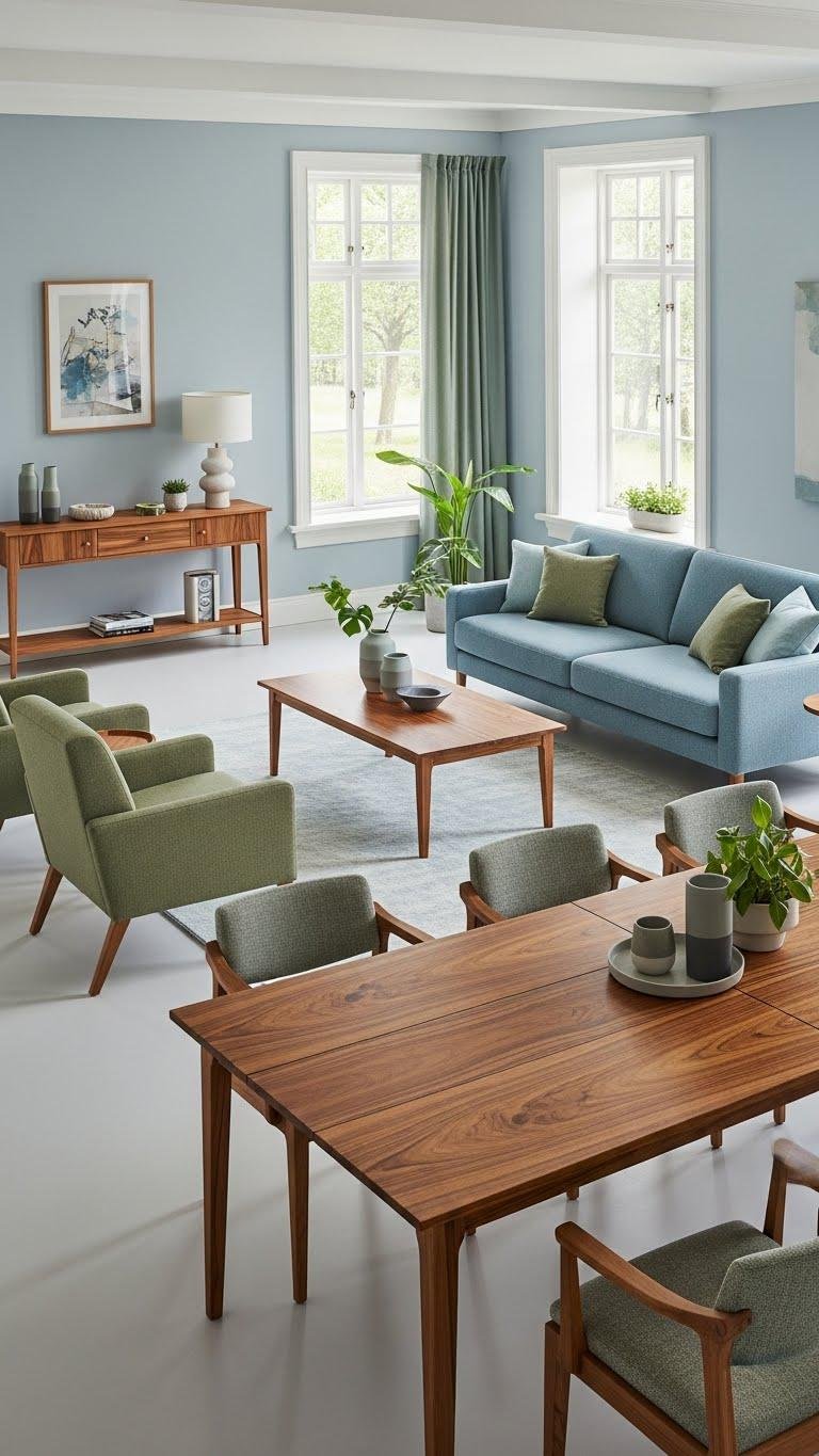 After introducing soft blues and muted greens, bring in rich wood tables to anchor the room and add tactile warmth. You’ll choose pieces like hand rubbed teak consoles and dining tables with a grain focused inlay to create depth.