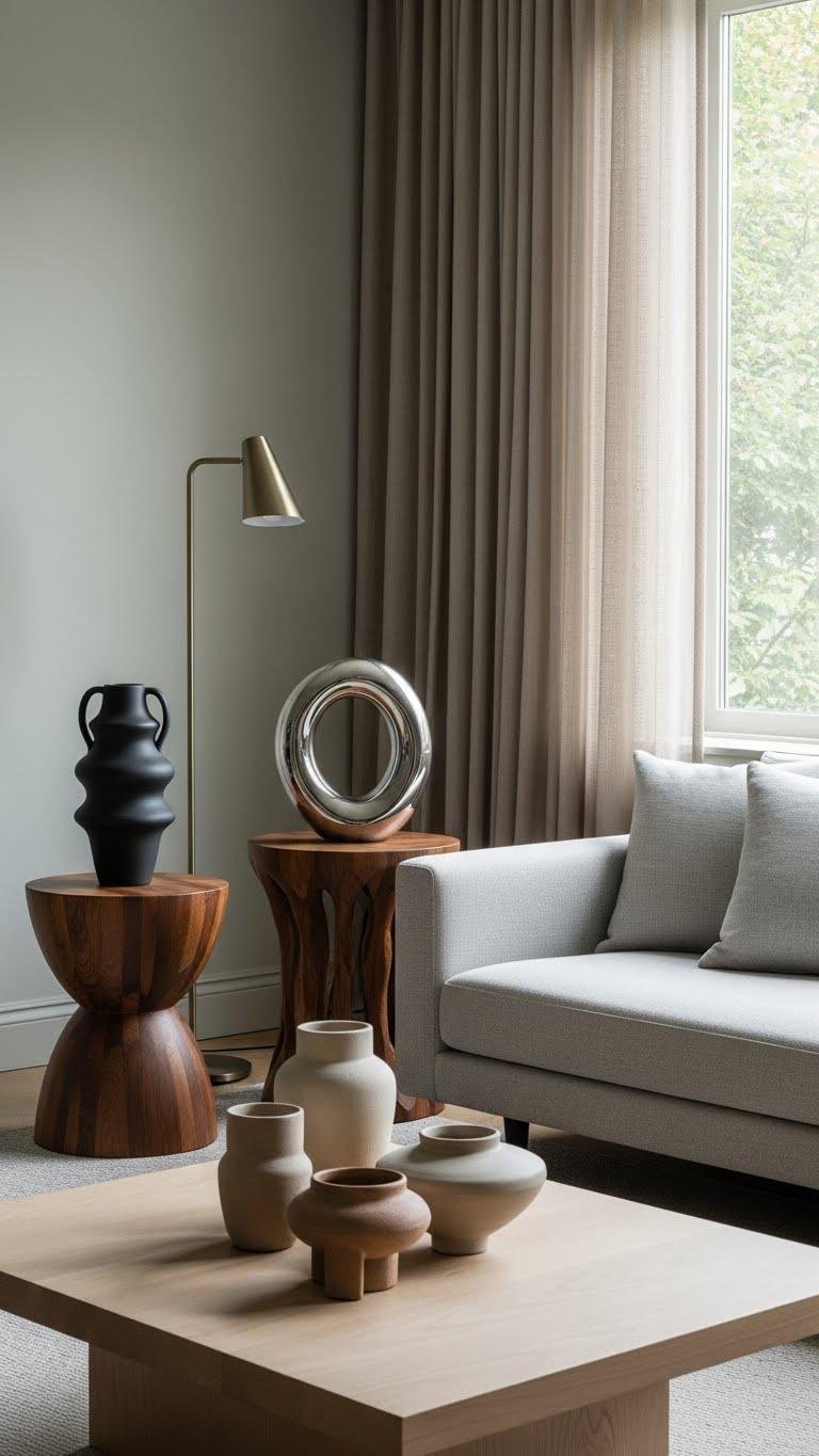 Bring in sculptural side tables and objects to punctuate the room’s calm palette with purposeful form and tactile interest. You’ll select pieces with organic silhouettes that read as art and function.