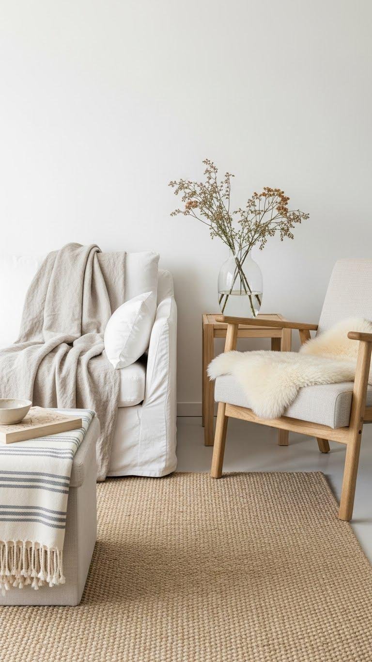 Regularly swapping textiles with the seasons keeps a neutral room feeling fresh and purposeful: you’ll trade heavy wool throws and layered rugs for lightweight linens and airy sheepskins, then reintroduce denser weaves and warmer tones as temperatures drop.