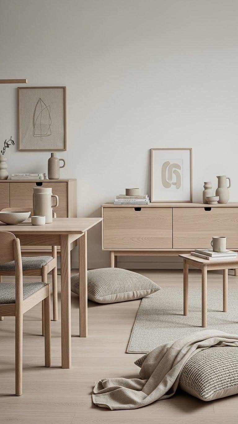 Introduce pale wood furniture to keep a neutral scheme feeling airy and contemporary without sacrificing warmth. You’ll choose oak, ash, or birch with matte finishes, balancing scale and texture.