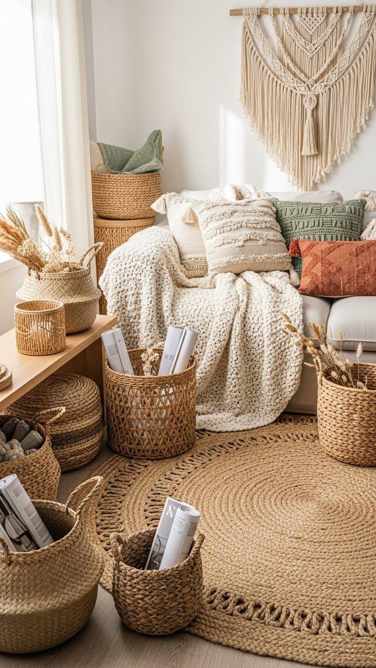 Mix natural fibers—seagrass, jute, cotton—for contrast in scale and weave. Keep palette muted, let texture create warmth, and allow pieces to evolve with your lifestyle.