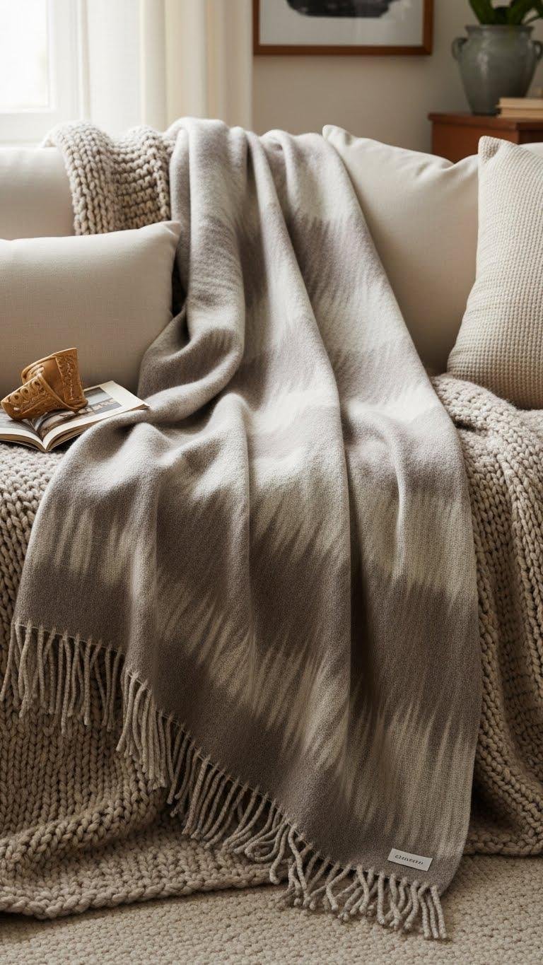 Often you’ll reach for a wool throw to instantly elevate both comfort and style in a neutral room—its weight, hand, and drape add purposeful warmth without changing the palette. You’ll choose hand dyed throws for subtle depth and artisanal character, layer textures confidently, and let chunky fringe punctuate edges.