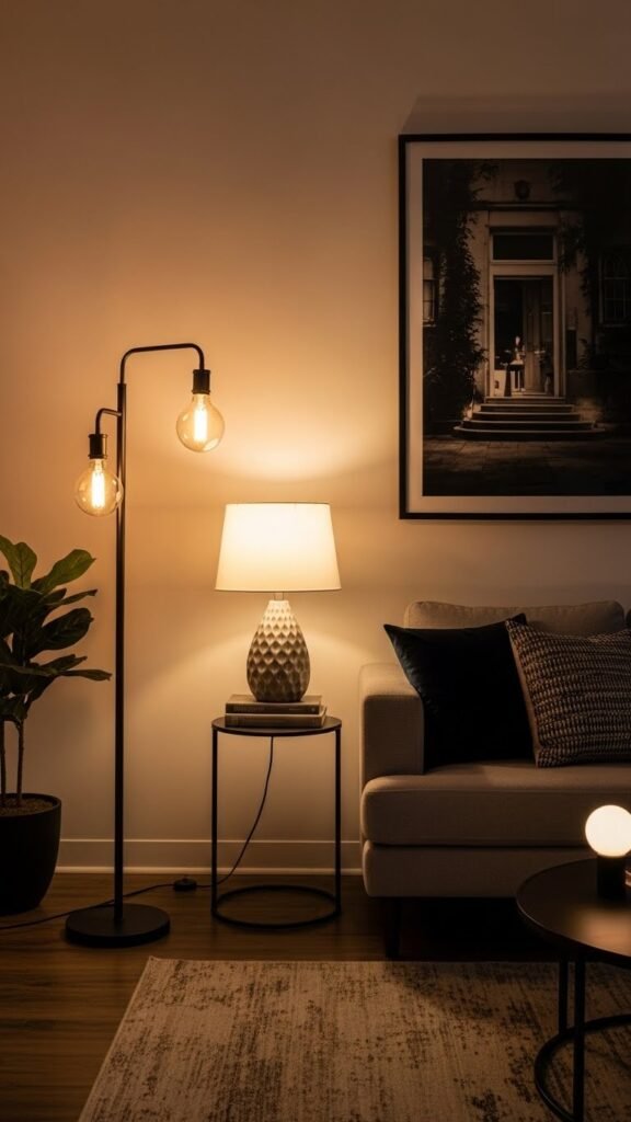 You’ll use floor dimmers for seamless shifts, balance lamp placement to frame seating, and mix warm bulbs and sculptural fixtures so your living room feels liberated, stylish, and effortlessly adaptable.