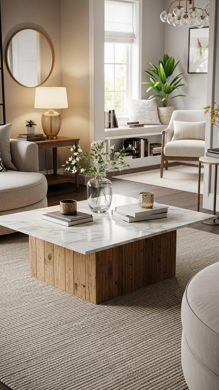 After you’ve carved out a cozy reading corner with rounded seating, bring that same relaxed sophistication to the center of your living room by pairing a cool marble top with a warm reclaimed-wood base. You’ll enjoy reclaimed craftsmanship that tells a story while marble maintenance stays simple with seals and soft cloths.