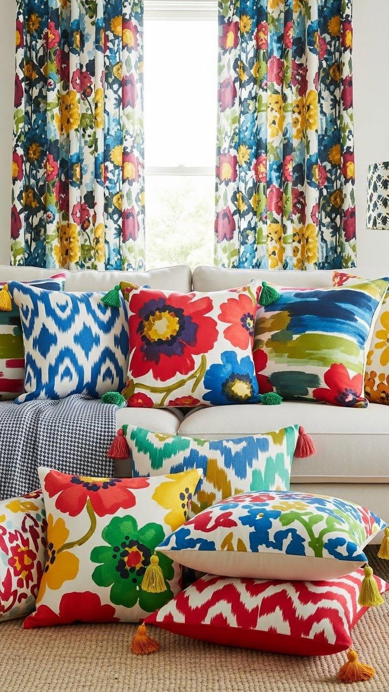 Plunge into pattern play by layering bold throw pillows and statement curtains to instantly energize your spring living room; mix oversized florals, geometric ikats, and painterly abstracts in complementary colors to create a cohesive yet lively look.