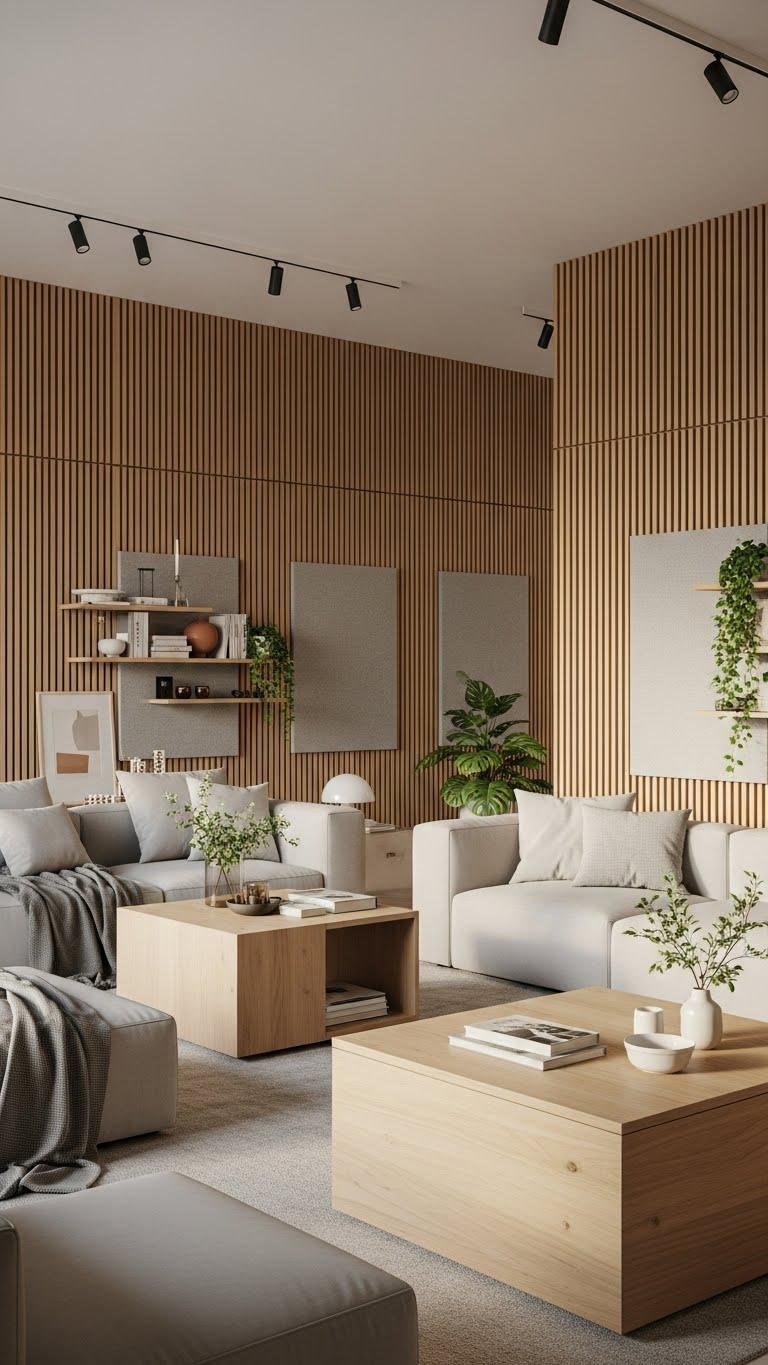 Introduce slatted wood panels to bring instant warmth and tactile interest to your spring living room; their linear rhythm adds modern structure while the natural grain softens the space and complements fresh fabrics and greenery.