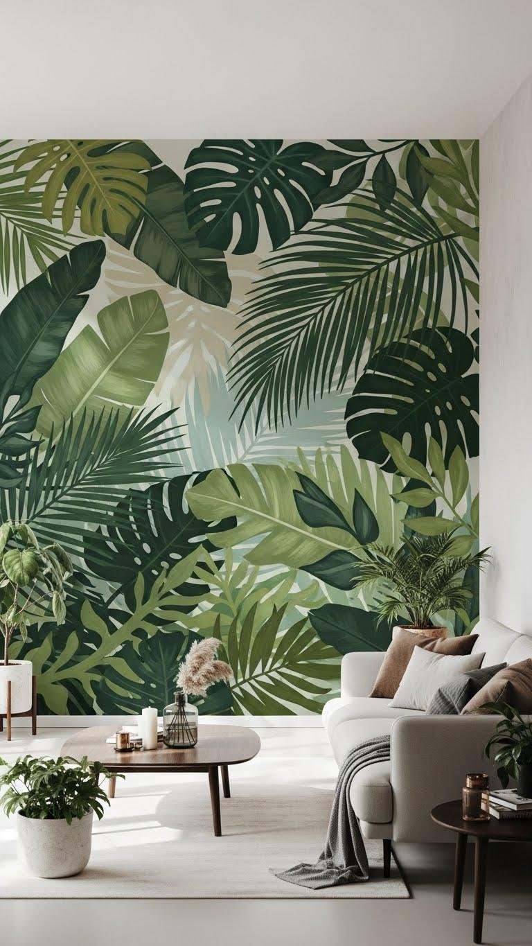 A sweeping botanical mural can instantly set the tone of your spring living room, turning a plain wall into a verdant focal point that feels both fresh and sophisticated.