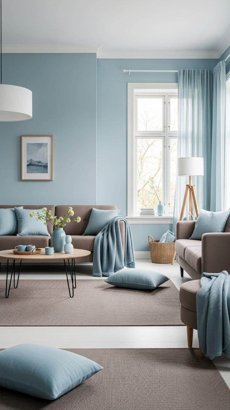 Although soft blues carry a cool serenity, pairing them with warm taupes creates a balanced, hugged-by-nature palette that calms and grounds a living room.