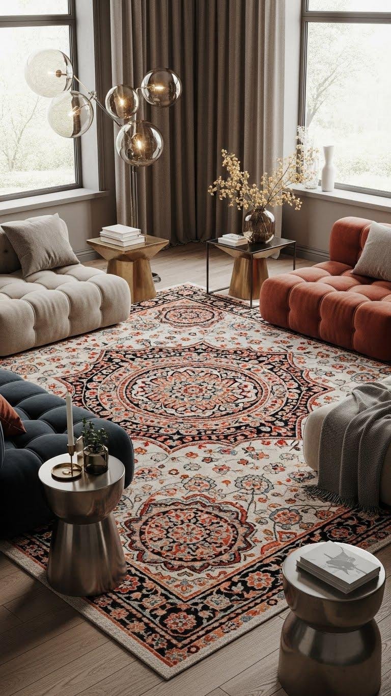 Often a richly patterned area rug becomes the room’s anchor, grounding modular seating and warming metallic accents with layered color and texture.