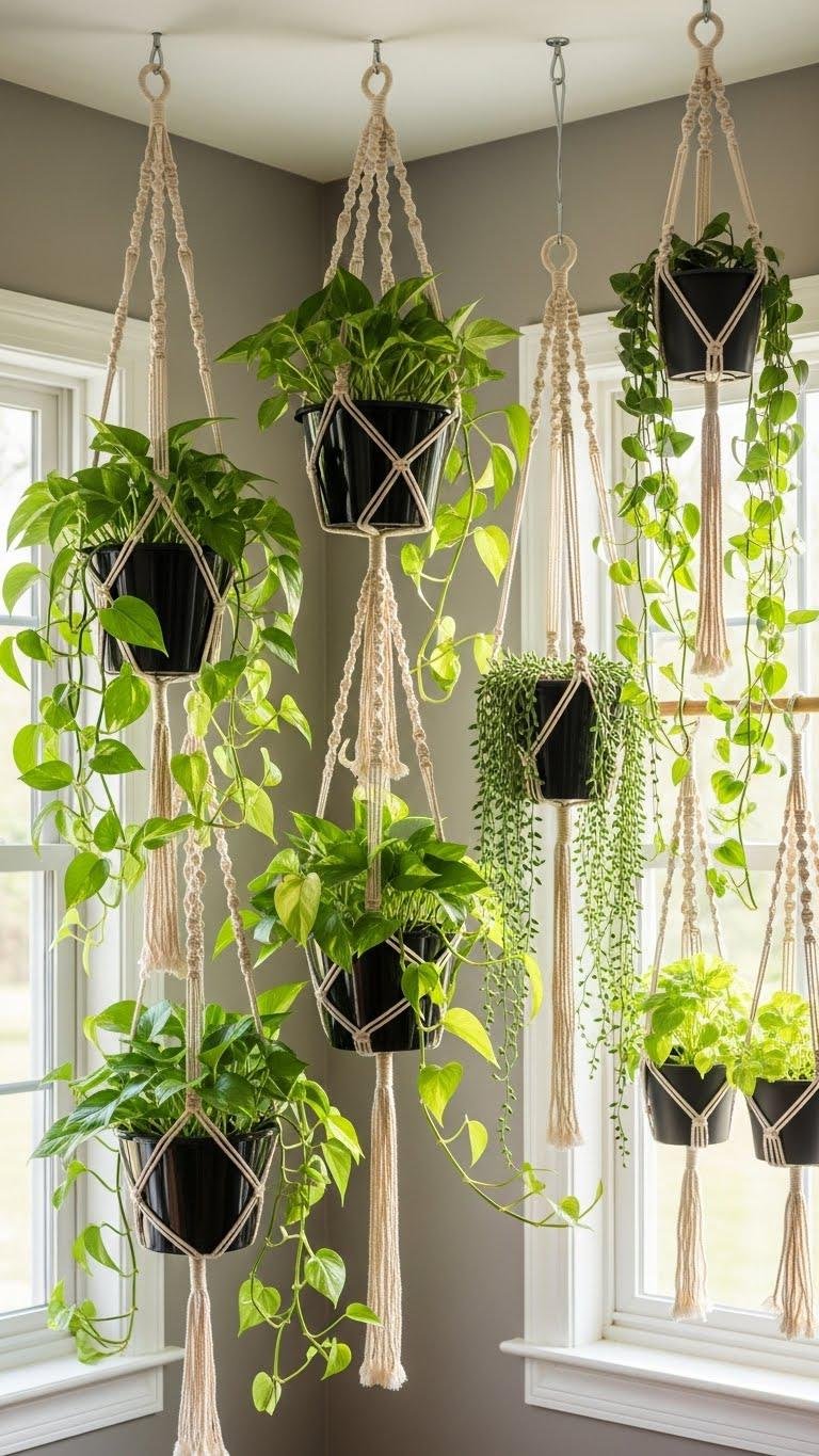 Bringing greenery up into the air with hanging planters and macramé instantly lifts a room, creating vertical interest without stealing floor space; mix trailing pothos, heartleaf philodendron, and airy string-of-pearls to sculpt living cascades that soften hard edges and punctuate sightlines.