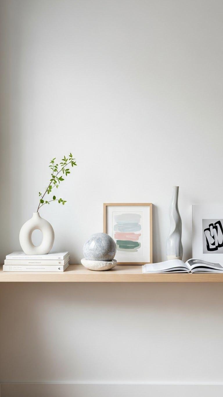 Clear out the catch-all clutter and arrange a handful of thoughtfully chosen pieces so your shelves read like a gallery, not a storage closet. You’ll create minimalist vignettes that breathe, mixing books, art, and sculptural ceramics to punctuate negative space.