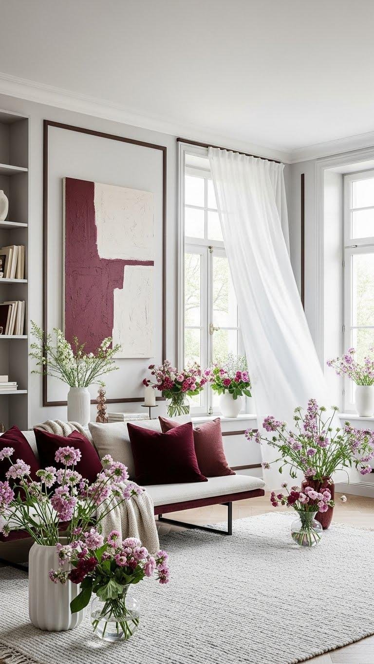 Anchor your spring palette with deep burgundy or chocolate accents to give light, airy rooms a sophisticated edge. You’ll balance airy neutrals with bold pops—think velvet accents on throw pillows and a low sofa, paired with cocoa trims on shelving and frames.