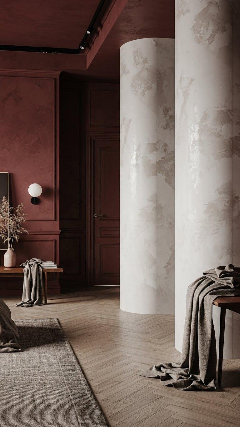 Those rich burgundy and chocolate accents gain depth when paired with tactile wall treatments—Venetian plaster or textured paints add sculptural warmth that complements luxe fabrics.