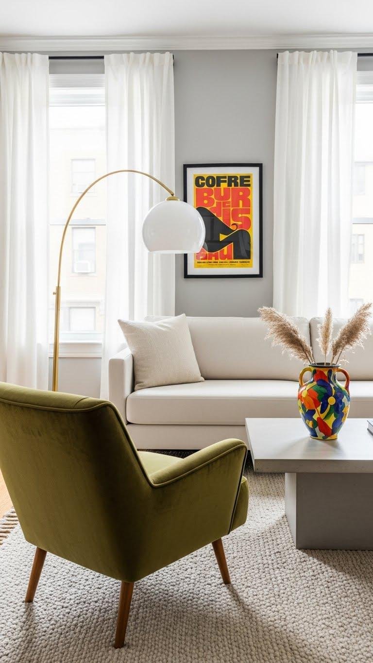 Mix vintage finds with modern lines to create a living room that feels layered and intentional rather than matched and predictable.