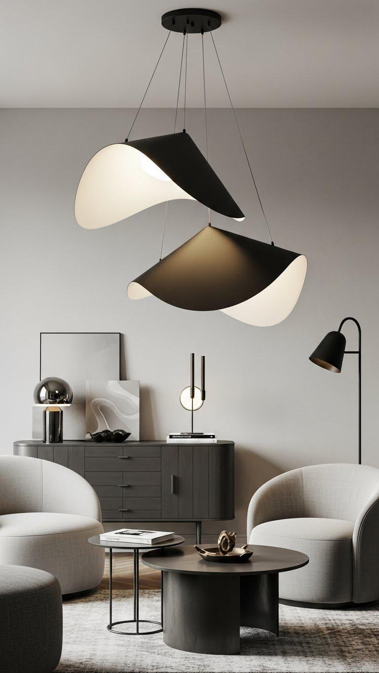 Choose sculptural pendants with dramatic silhouettes to anchor the space, cast sculpted light, and create movement overhead. You’ll enjoy a liberated, curated vibe—mix metals or matte finishes, hang at varied heights, and let the fixture become a confident focal point that celebrates airy, spring openness.