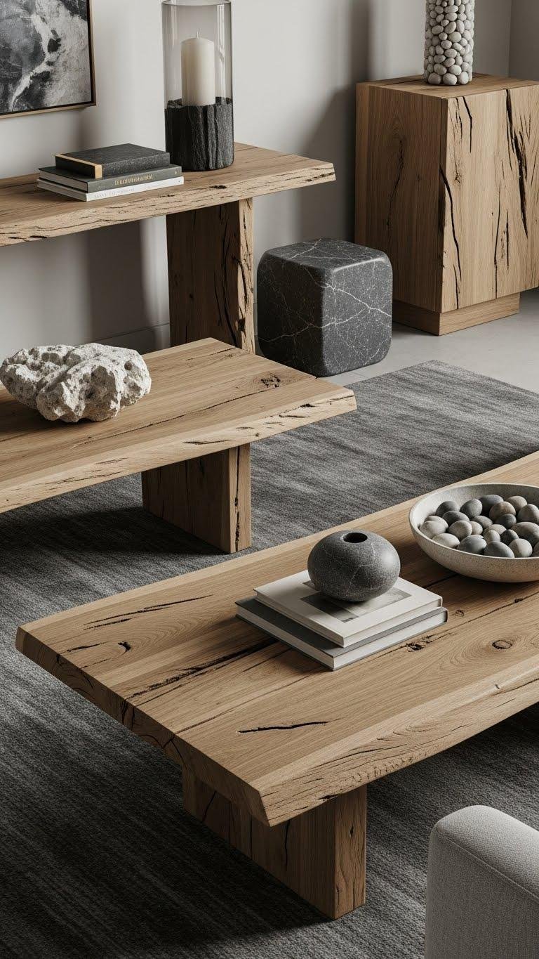 Mixing natural wood furniture with stone surfaces brings a grounded, modern warmth to your living room that feels both curated and effortless. You’ll pair weathered oak consoles and live edge coffee tables with basalt accents and pebble surfaces to craft tactile contrast.
