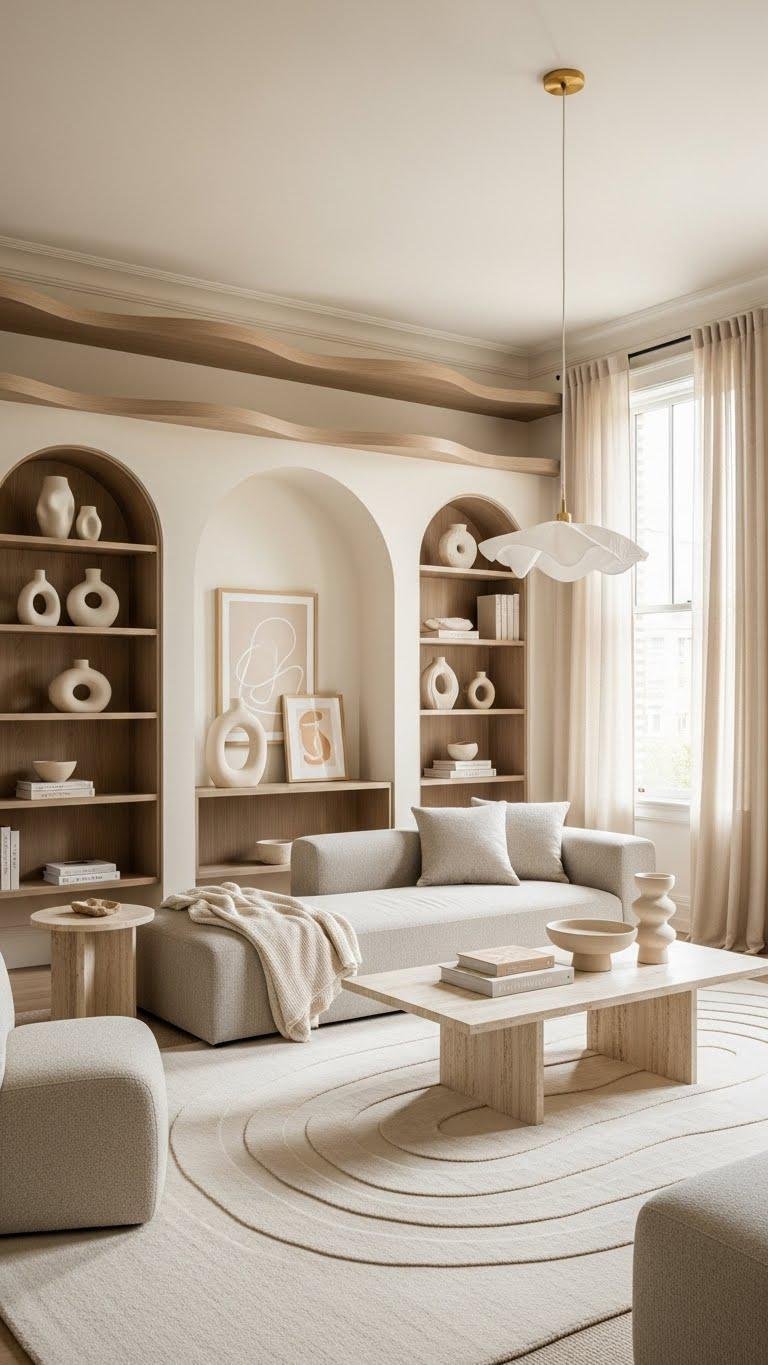 With a gentle, undulating silhouette, wavy shelves and arched bookcases soften corners and guide sightlines so your eye moves through the room with ease. You’ll choose wavy shelving to create rhythm and lightness, pairing it with arched alcoves to frame art and objects.