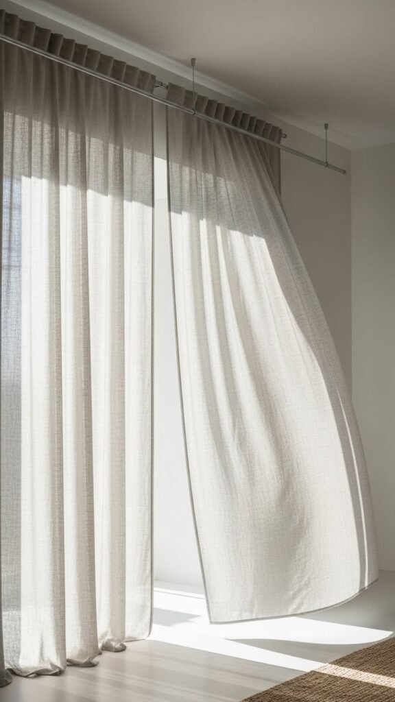 Floating from a simple rod, linen drapes lend airy lightness without stealing the room’s calm — they filter sunlight into a soft glow, diffuse harsh shadows, and keep the palette feeling breathable.