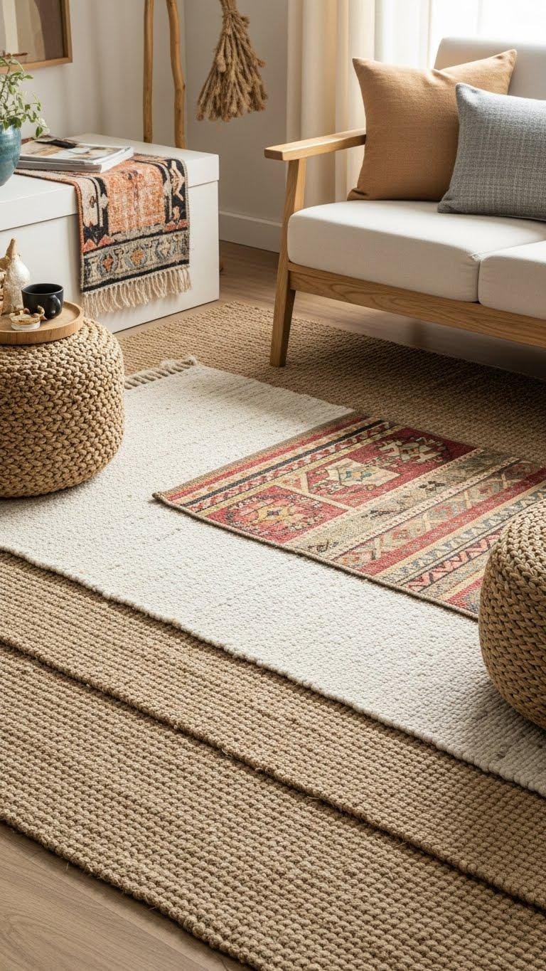 Often you’ll anchor a room by layering textured rugs in natural fibers—think a jute or sisal base topped with a soft, low-pile wool or cotton flatweave—to add depth, warmth, and tactile contrast.