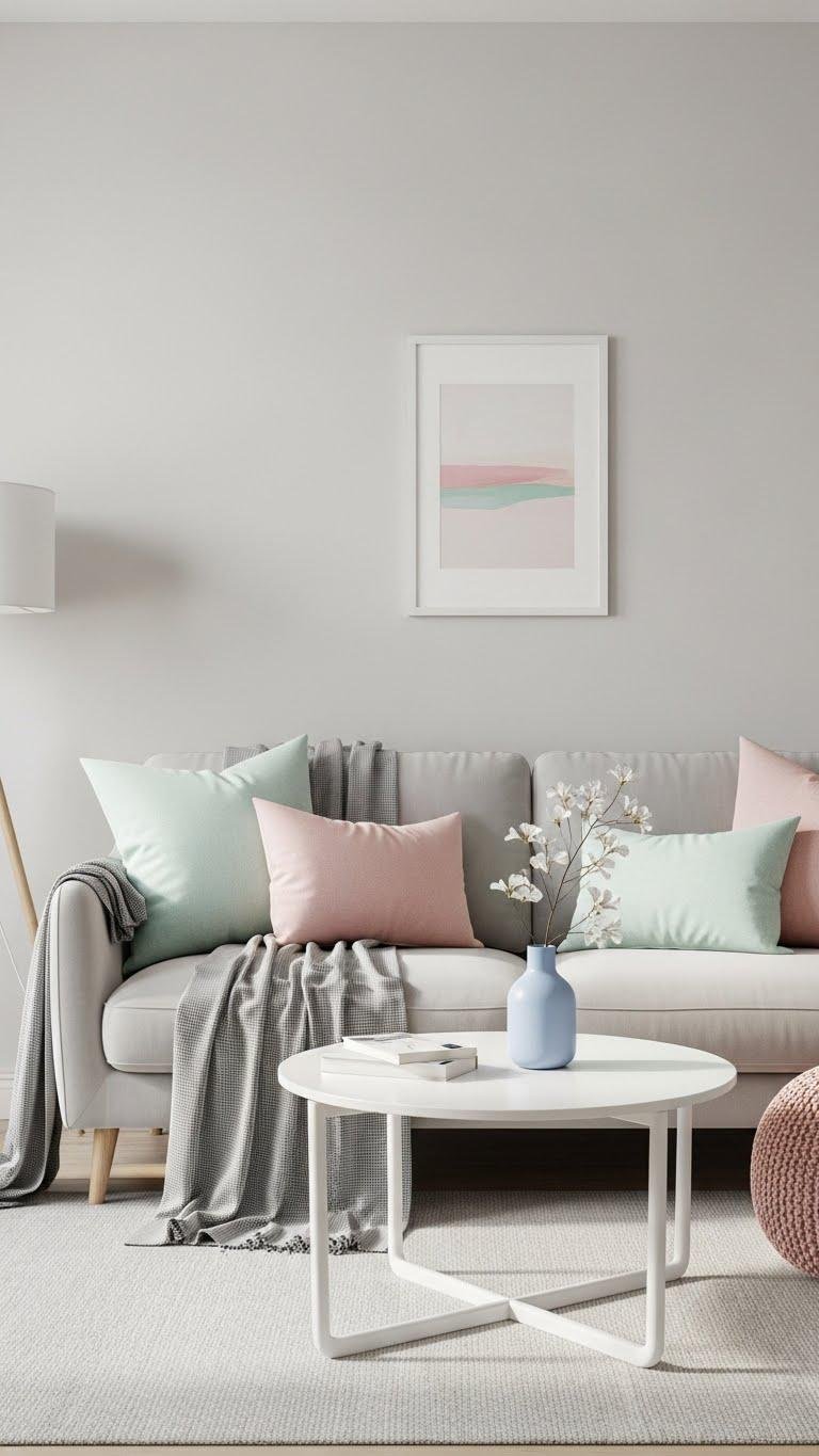 Tuck in a few soft pastel accents to lift a neutral scheme without overpowering it: pick one or two muted tones—blush, mint, or powder blue—and repeat them sparingly in pillows, a small vase, or a single art piece.