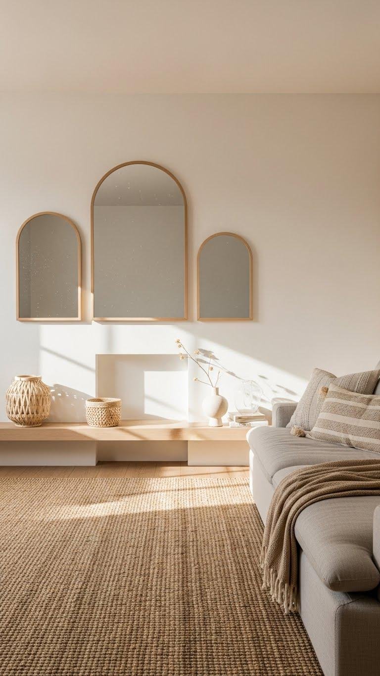 Pair woven textures with reflective surfaces to amplify light and keep that soft, airy feel you’ve created. Hang arched mirrors with deliberate arched placement above consoles or low mantels to increase light diffusion and expand sightlines.