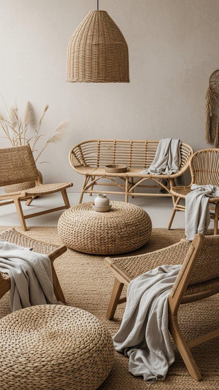 Bring in jute and rattan seating to ground a neutral room with tactile warmth and effortless scale. You’ll choose low-profile chairs, a curved rattan bench, or a seagrass pouf to add casual comfort and mobility. Pair them with a woven pendant overhead and light linen throws so the space breathes—organic texture, laid-back structure, and freedom to rearrange as moods shift.