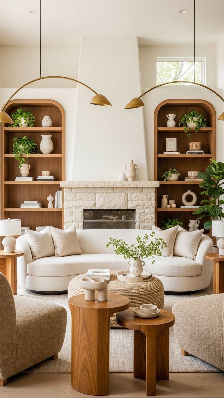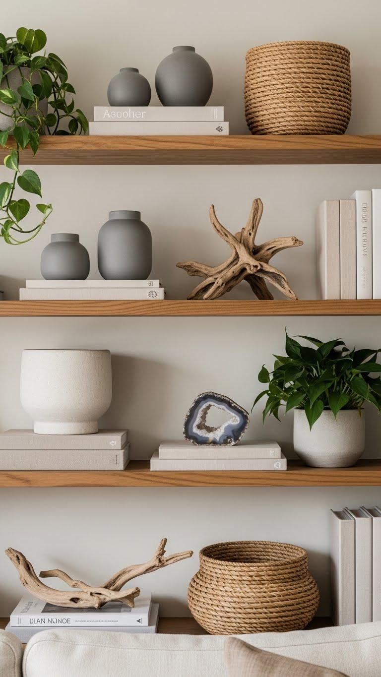 Once your seating anchors the room in warm, tactile tones, let open shelves echo that same calm by curating a small collection of natural objects—think matte stoneware, driftwood sculptures, woven baskets, and a few well-placed botanicals.