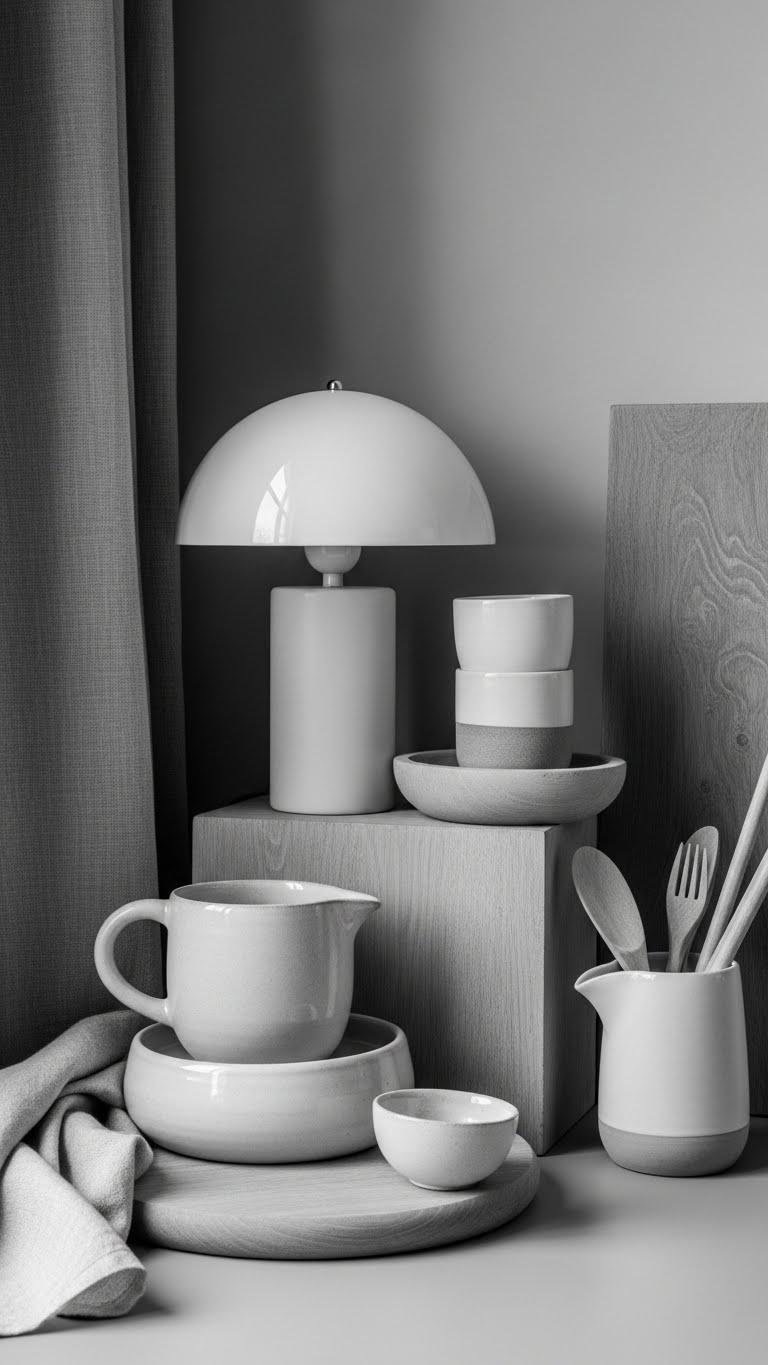Choose a base in soft gray or muted taupe, then layer varied finishes—matte ceramics, brushed wood, linen folds—to create depth.