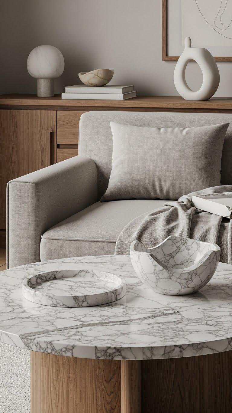 Anchoring a neutral spring palette with stone or marble pieces gives your room instant quiet luxury and textural contrast. Choose small trays, side-table tops, or sculptural bowls with veined surfaces and polished edges to punctuate calm spaces.