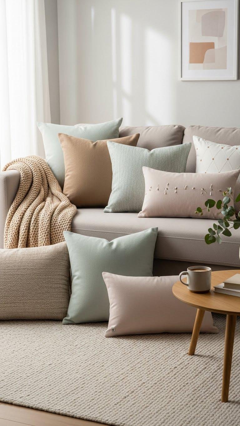 A few soft, muted throw pillows can instantly ground a seating area while keeping a calm, cohesive look—you’ll want colors that whisper rather than shout, like warm taupes, pale sage, or chalky blush.
