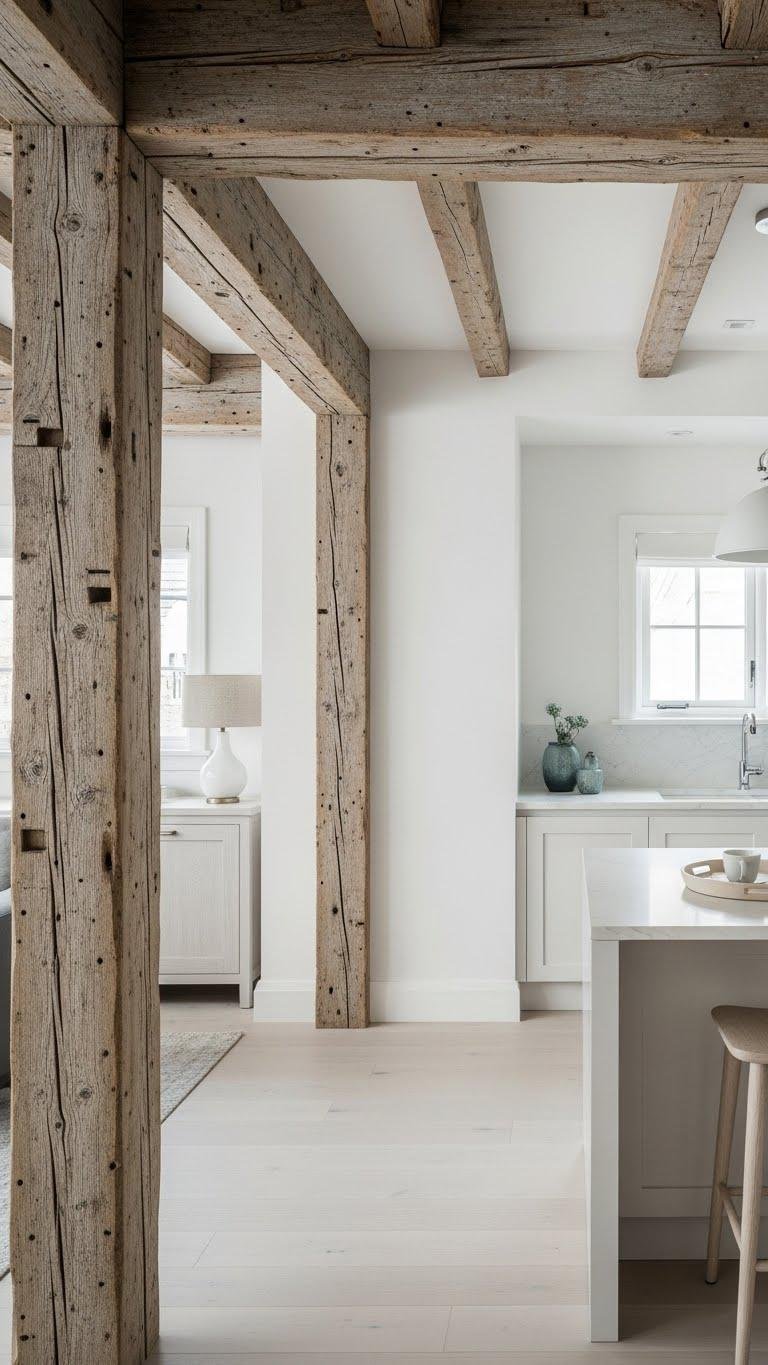 You’ll let weathered beams become focal texture while pairing them with soft whites, bleached oak, or matte plaster.
