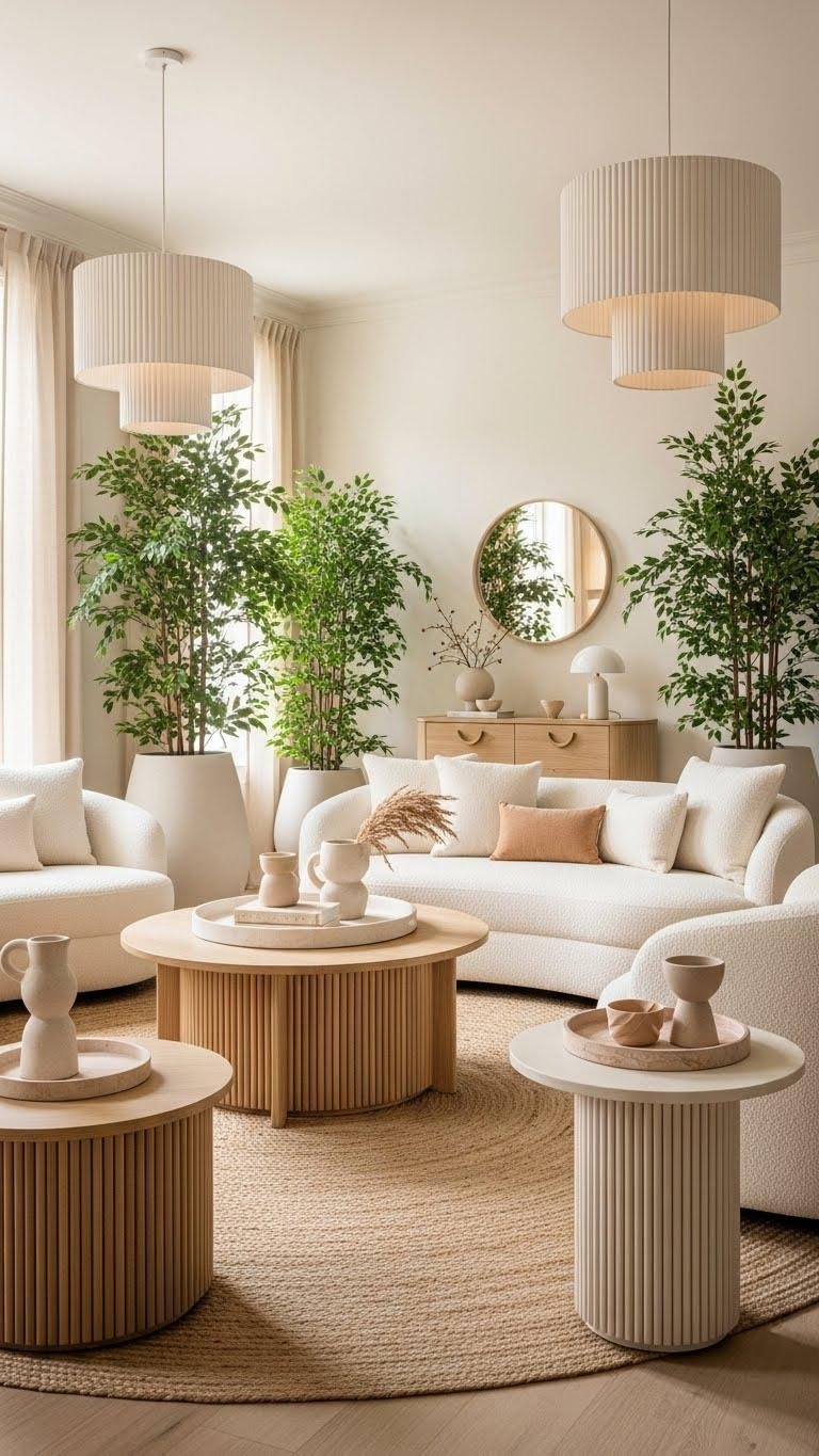After anchoring the room with tall greenery, bring the same sense of rhythm and softness lower to the eye with fluted or rounded accent tables.