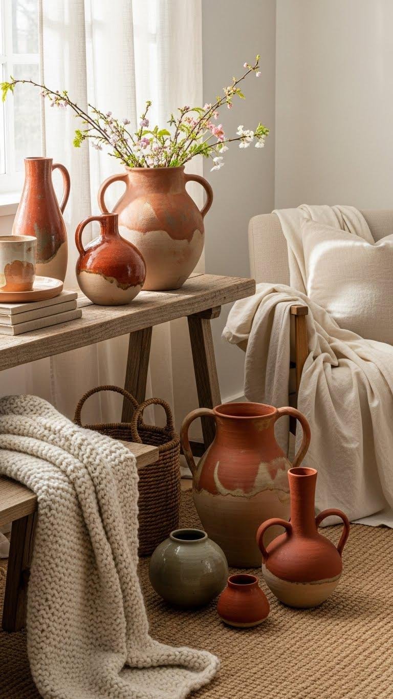 Bring in terracotta and clay to ground your spring palette with warm, earthen energy. Choose handmade pottery and sculptural vessels to add tactility and honest imperfection. Layer tones of clay and muted ochre that echo earthy pigments, creating calm contrast against creams.