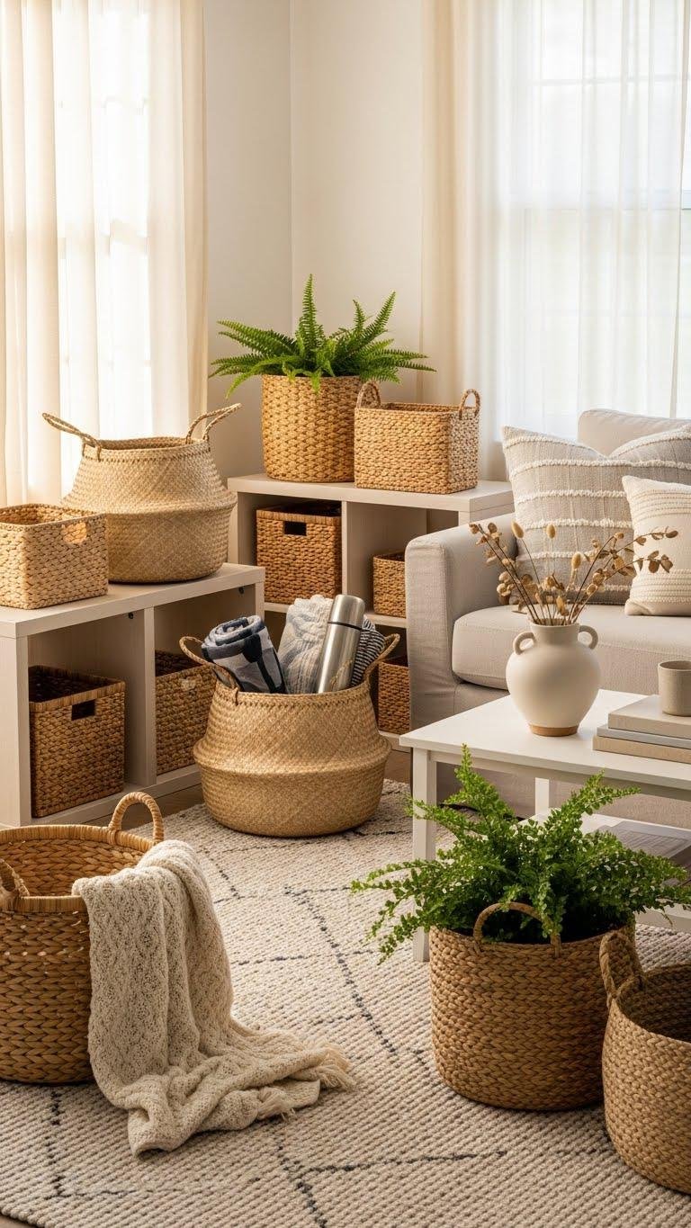 You’ll use woven storage to corral throws, plants, and picnic essentials, keeping spaces airy yet organized. Choose textured baskets in natural tones and varied sizes to create rhythm and calm. They invite easy living, letting you grab what you need and move freely.