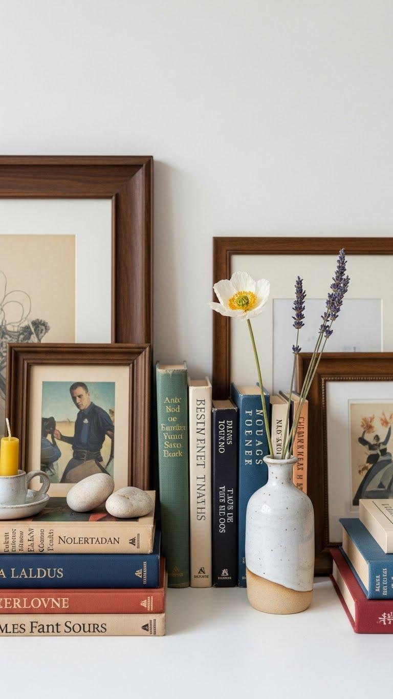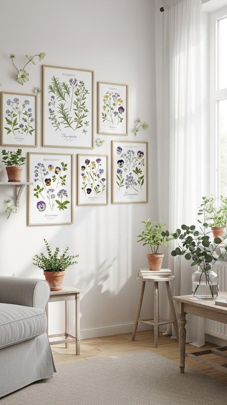 Bring pressed-flower frames out onto your shelves to add a delicate, botanical touch that feels both personal and seasonal. You’ll arrange pressed frames among books, small ceramics, and open space to create airy, intentional shelf vignettes.