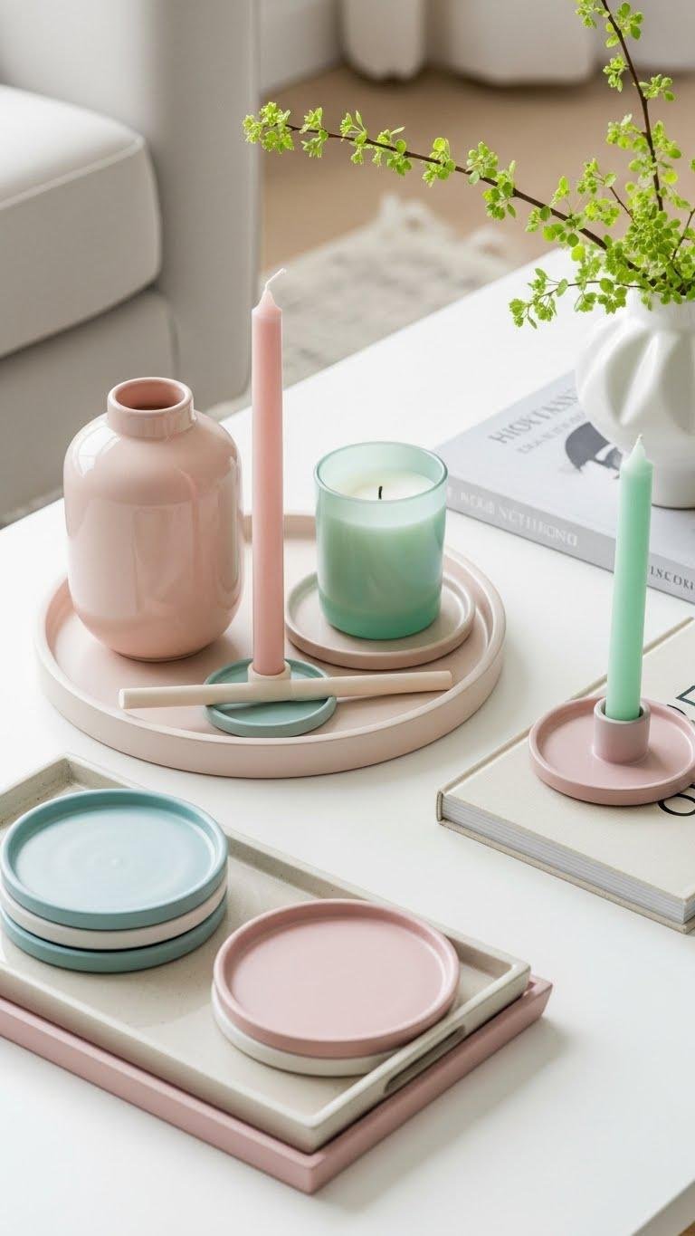 You’ll balance pastel coasters with ceramic trays, a sprig of fresh greenery, and a slender book. Keep it airy, curated, and easygoing so your space breathes.