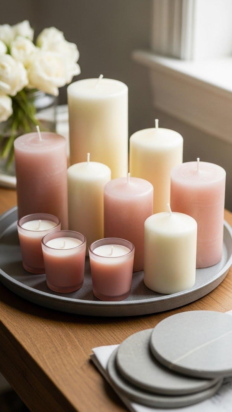 Once your tray reads light and intentional, carry that soft palette into candle choices to warm the room without overpowering it.