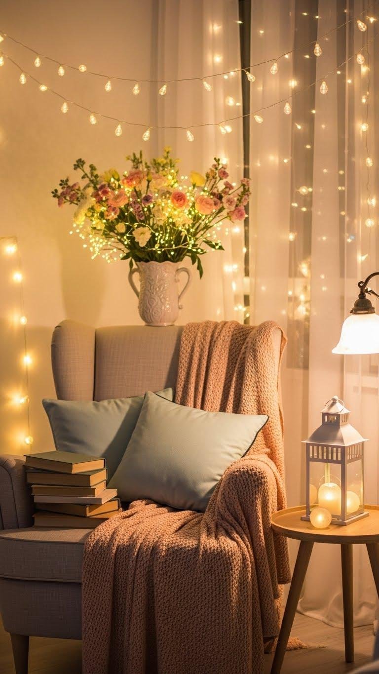 You can drape a twinkle canopy above a reading nook or hang bedside curtainlights for a liberated, cozy vibe. Choose soft bulbs and subtle placement so evenings feel open, calm, and effortlessly inviting.