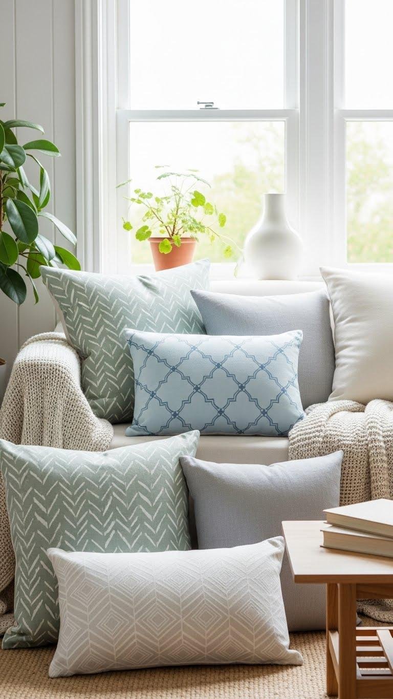Choose soft fabrics in breezy tones so you can reshuffle freely; a subtle chevron adds gentle motion, while a muted lattice brings calm structure.