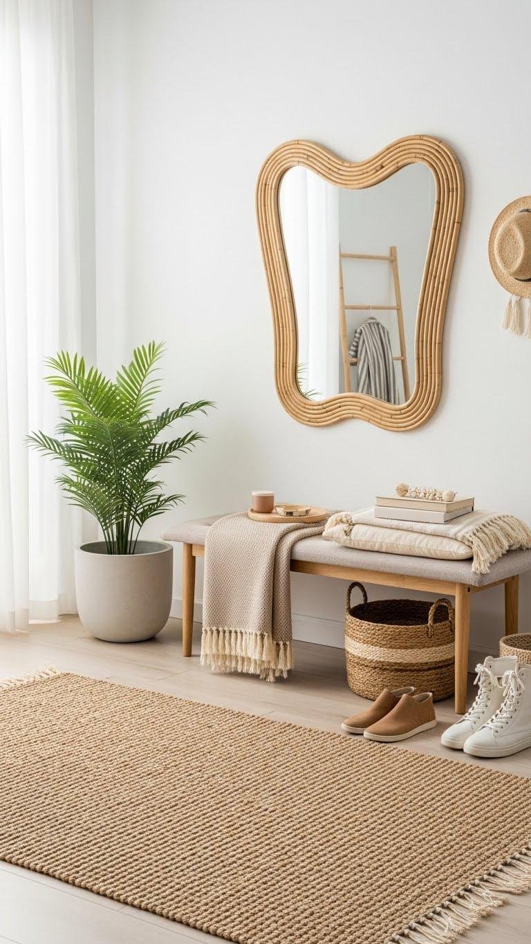 You’ll create a textural welcome with woven rugs, a sculptural mirror, and soft throws on a bench.