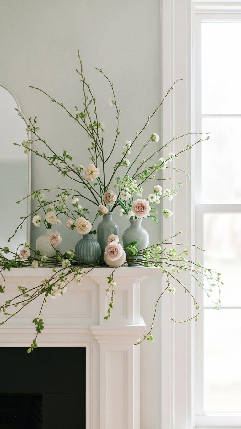 After arranging your plants for a gentle burst of green, carry that same organic rhythm to the mantel with soft, seasonal florals that feel effortless and edited.