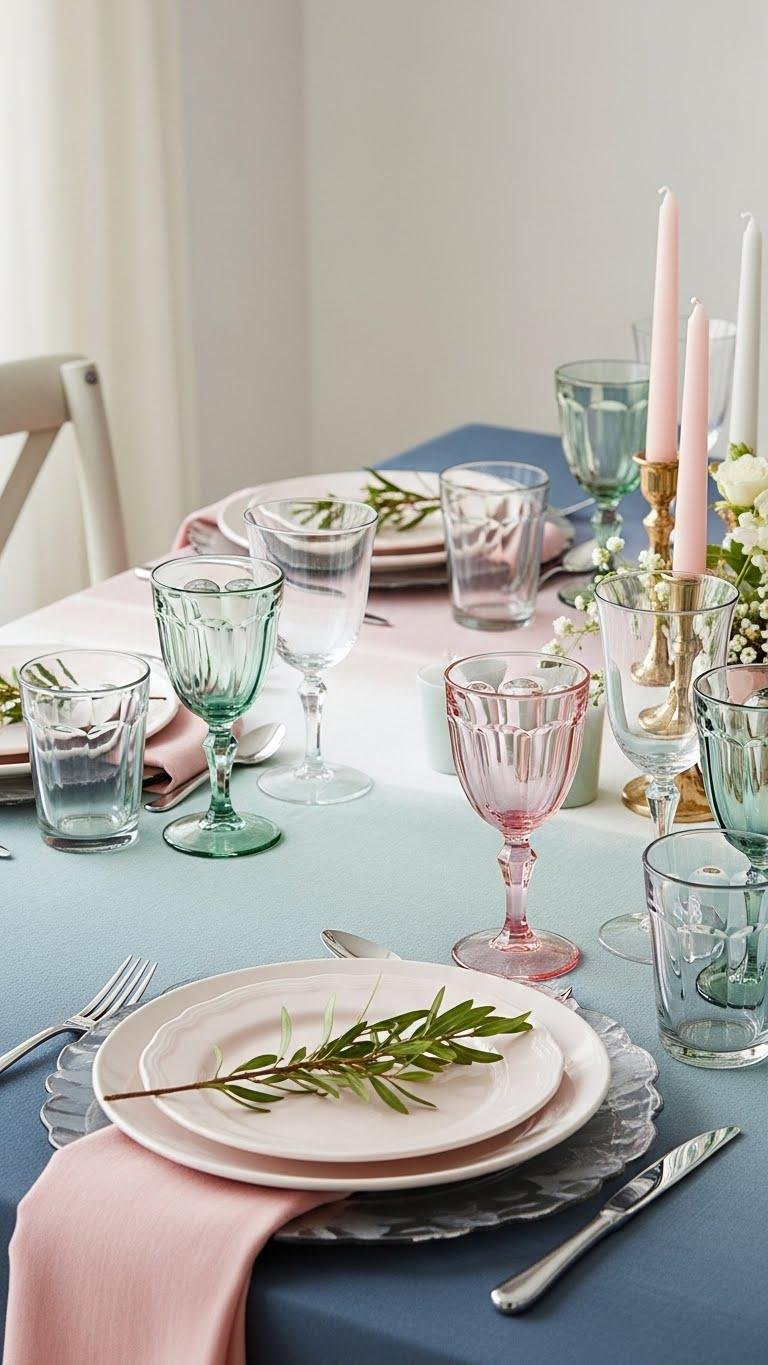 A pastel tablescape with mixed glassware invites you to slow down and savor small, seasonal details; pair milk‑soft pinks, muted celadon, and dove grays across vintage goblets and modern tumblers so each piece feels purposeful yet relaxed.