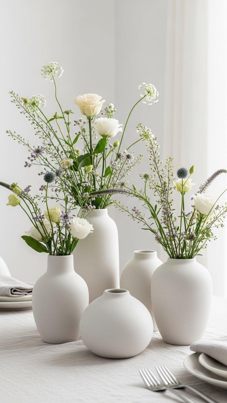 Pull the eye away from glass’s shimmer by placing matte ceramic vases in the center of your table; their soft, tactile finish grounds the palette and lets both fresh and dried blooms read like quiet statements.