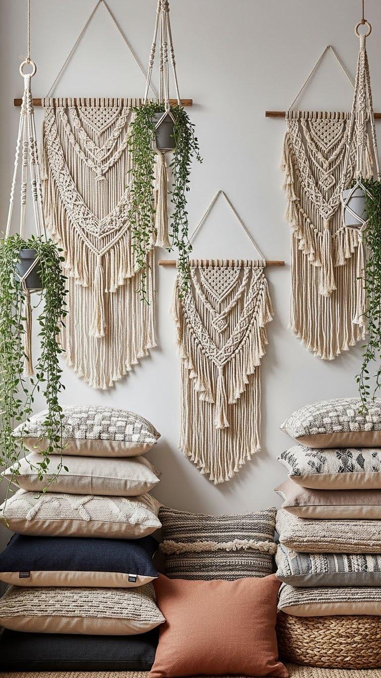 Layered pillows set the scene for tactile richness, and macramé wall hangings pick up that textural story on vertical surfaces to complete the room.
